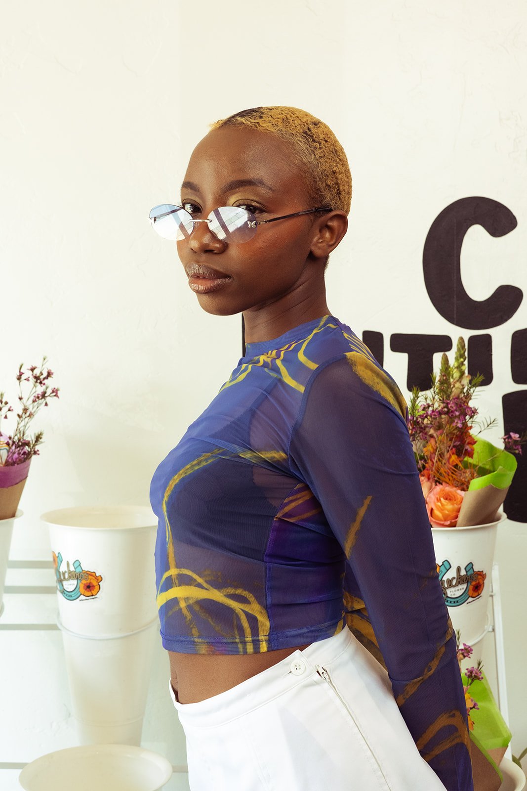Ocean Blue print on mesh fabric; long sleeved crop top.